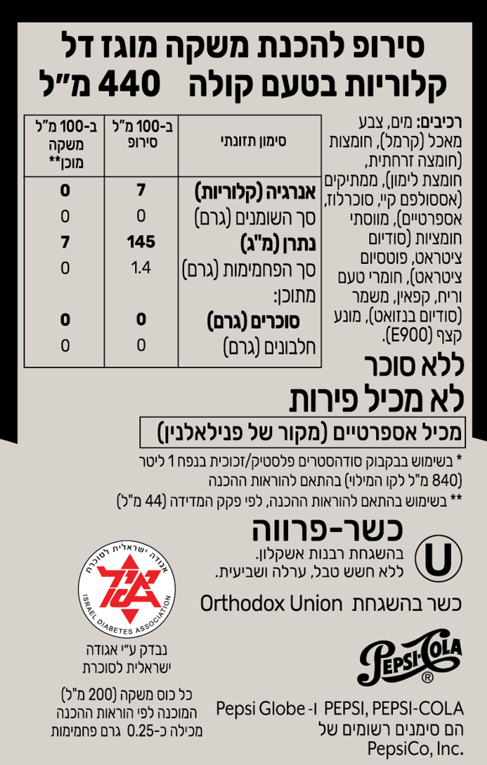 עם מקסימום טעם וללא סוכר, ®Pepsi Zero הוא החלופה דלת הקלוריות ונטולת הסוכר של ®Pepsi קולה הקלאסית. תהנו ממשקה מרענן בטריות אופטימלית ורמת הגזה מושלמת בכל רגע שרק תרצו.
