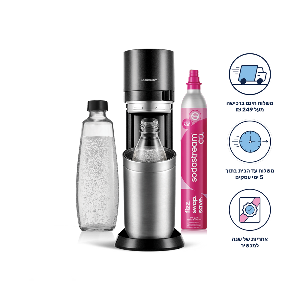 מכשיר סודהסטרים מדגם ®Sodastream DUO- הדרך המתקדמת ביותר להכנת סודה עם אפשרות הגזה בקראף זכוכית או בקבוק פלסטיק רב פעמי המתאים לשימוש במדיח. מעכשיו תוכלו ליהנות מהמשקאות האהובים עליכם גם בבית גם מחוצה לו
